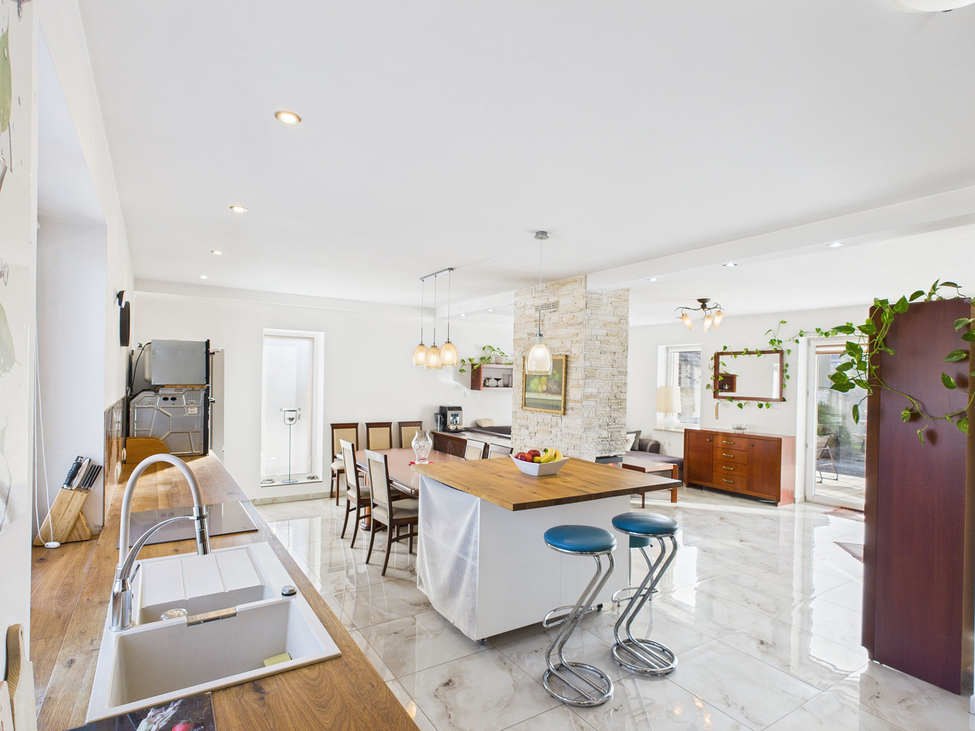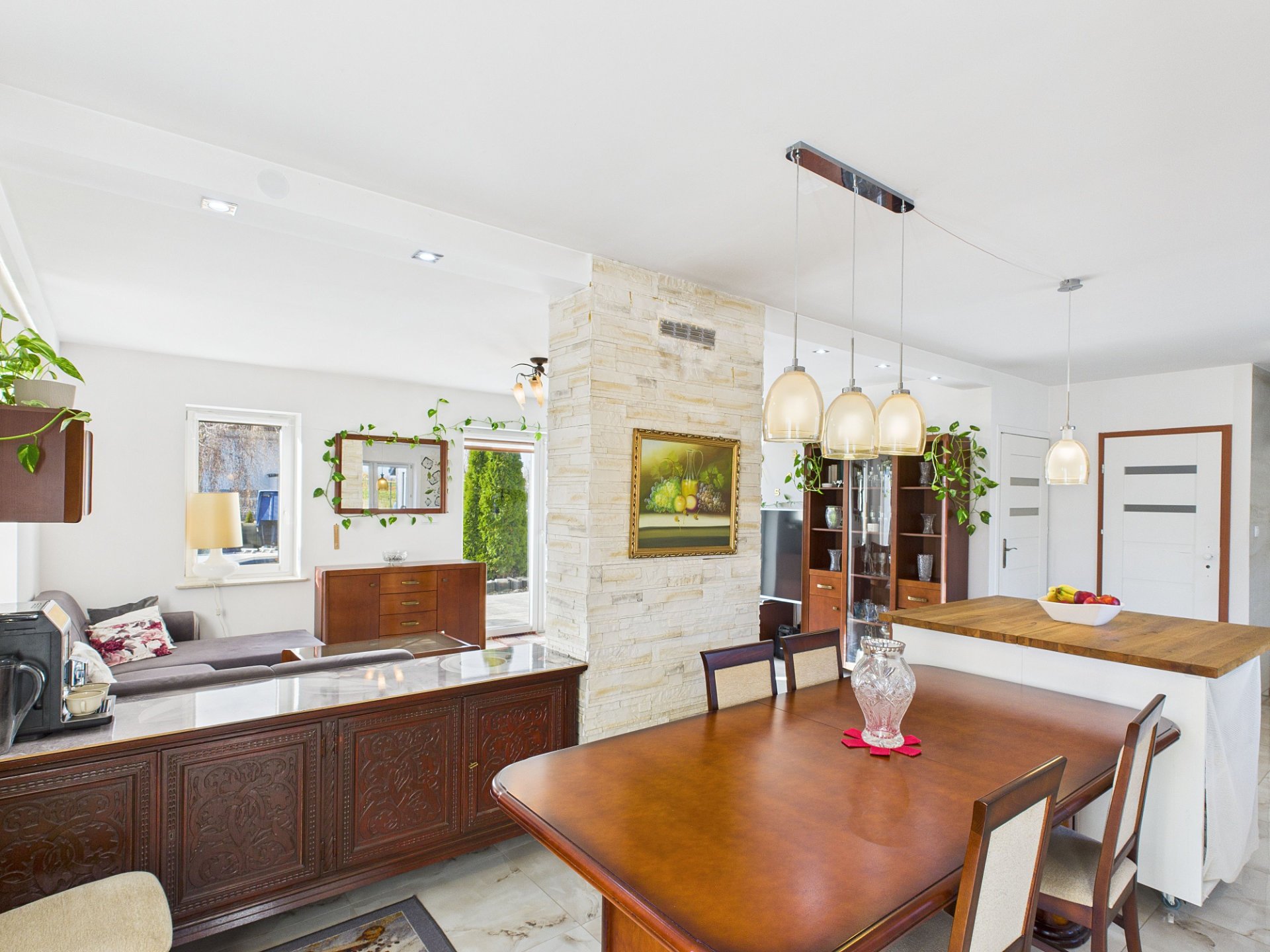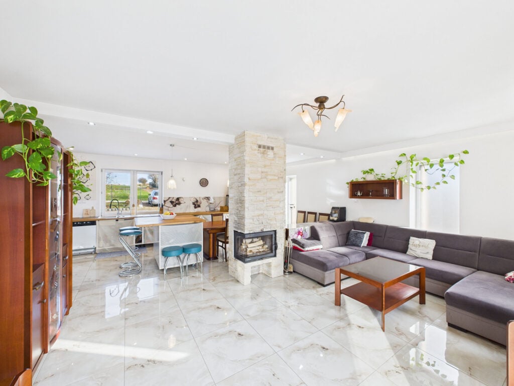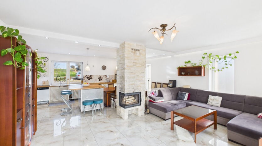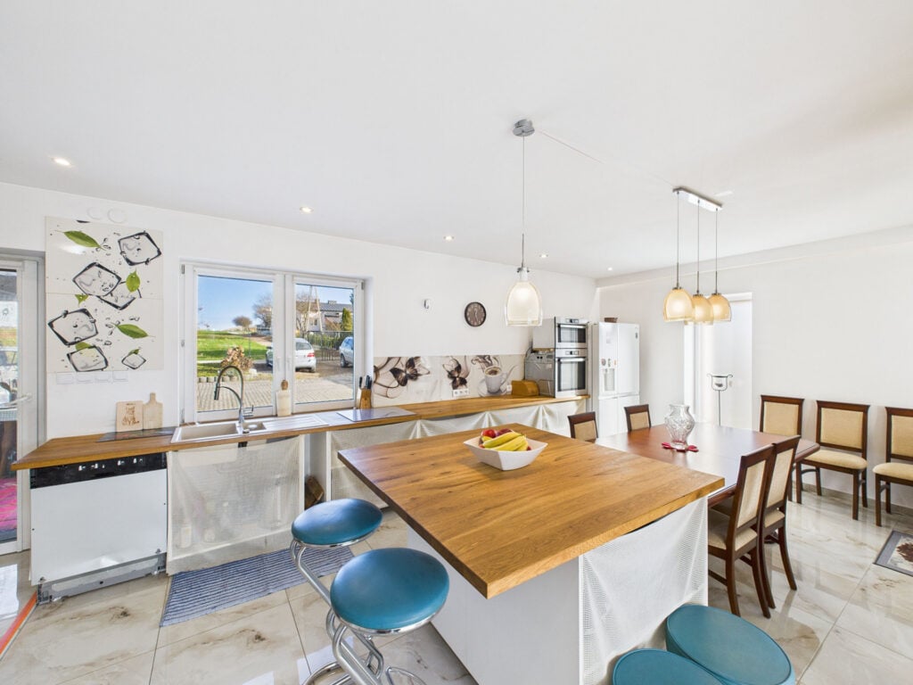- jasny salon połączony z kuchnią w aneksie – serce domu