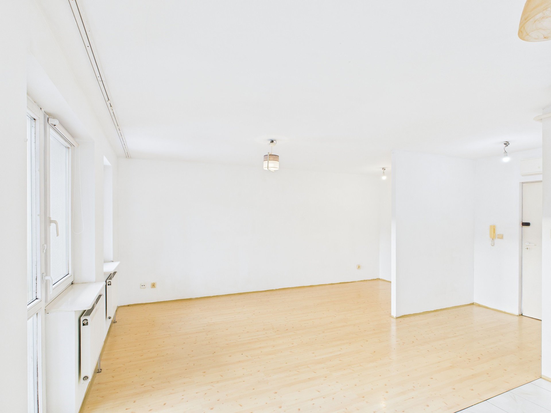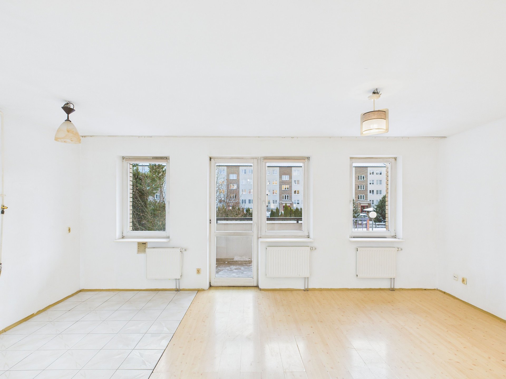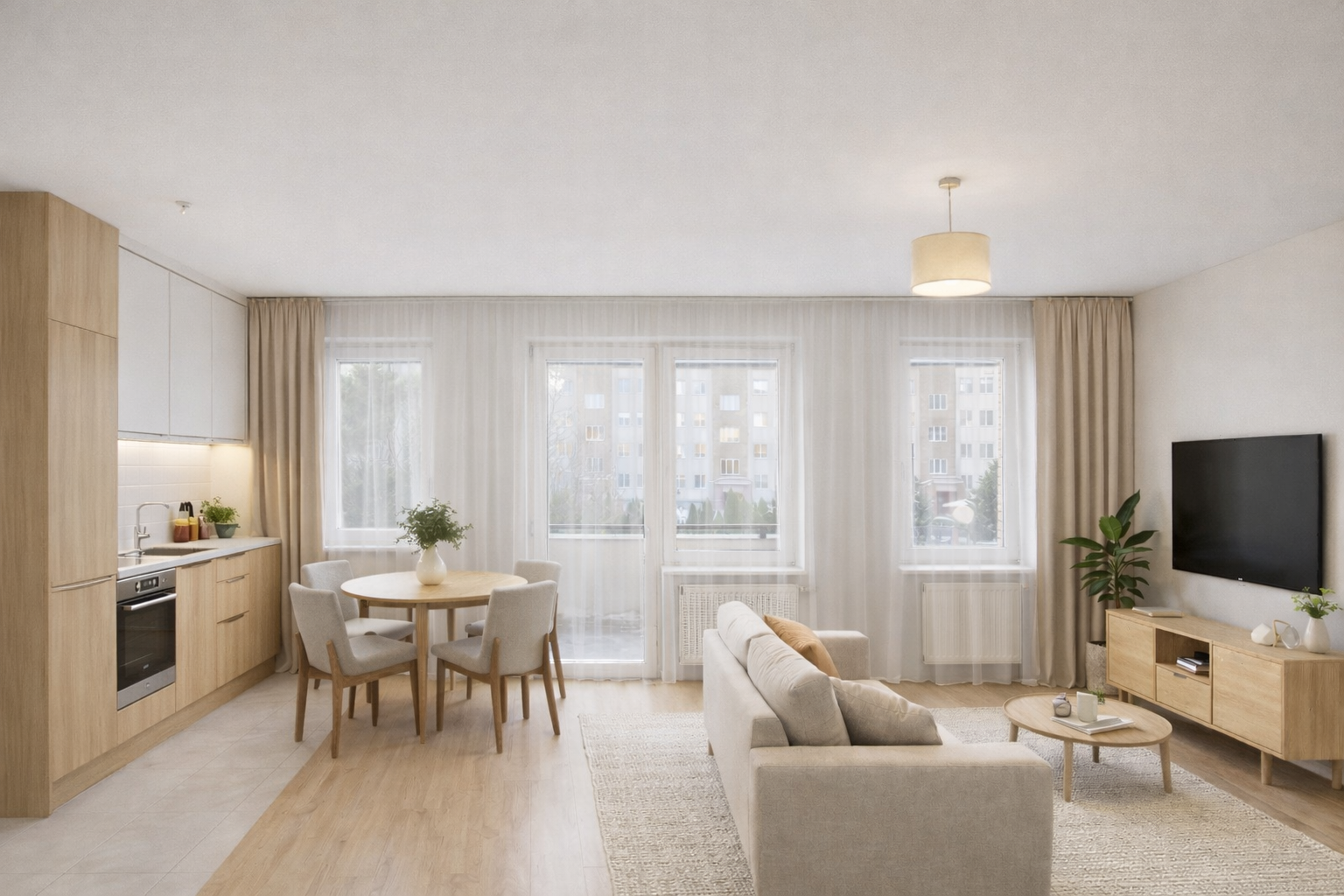 Duża, jasna przestrzeń, która daje sporo możliwości: od klasycznego salonu z sofą po sprytne wydzielenie części sypialnianej (np. ścianką, regałem lub zasłoną).