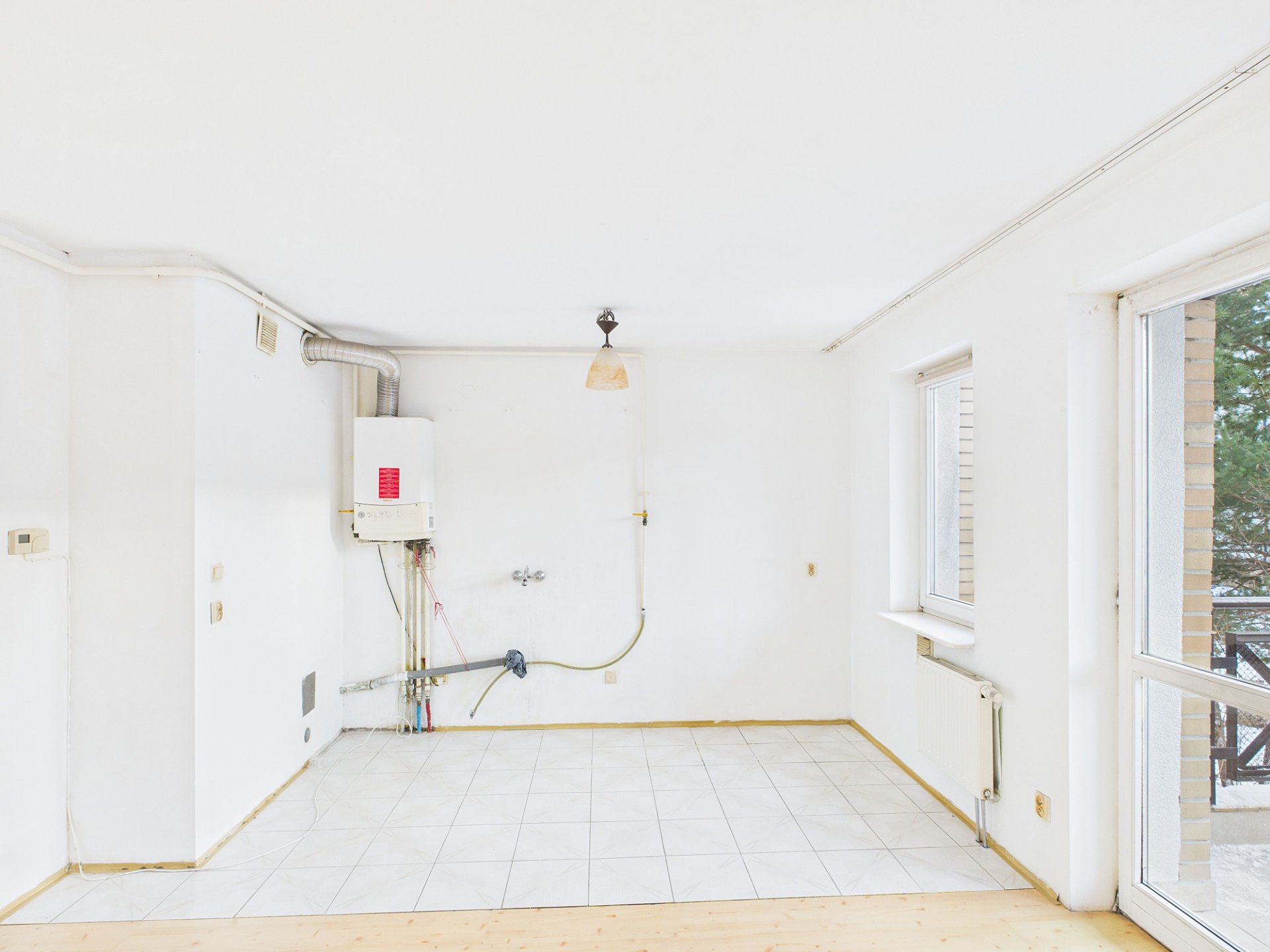 To dobre miejsce na zabudowę w kształcie litery „L” albo klasyczną linię z blatem roboczym.