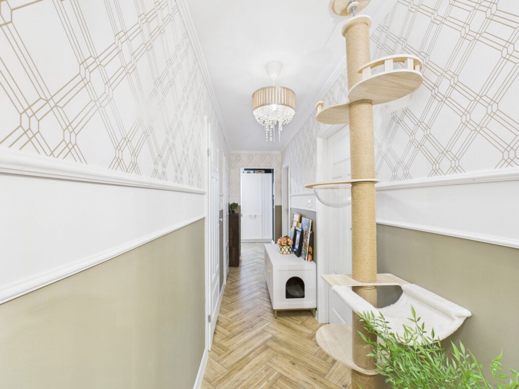 11,2 m² korytarza, który nie jest tylko przejściem – stylowe tapety, duże lustra i praktyczne szafy budują klimat eleganckiego holu.
