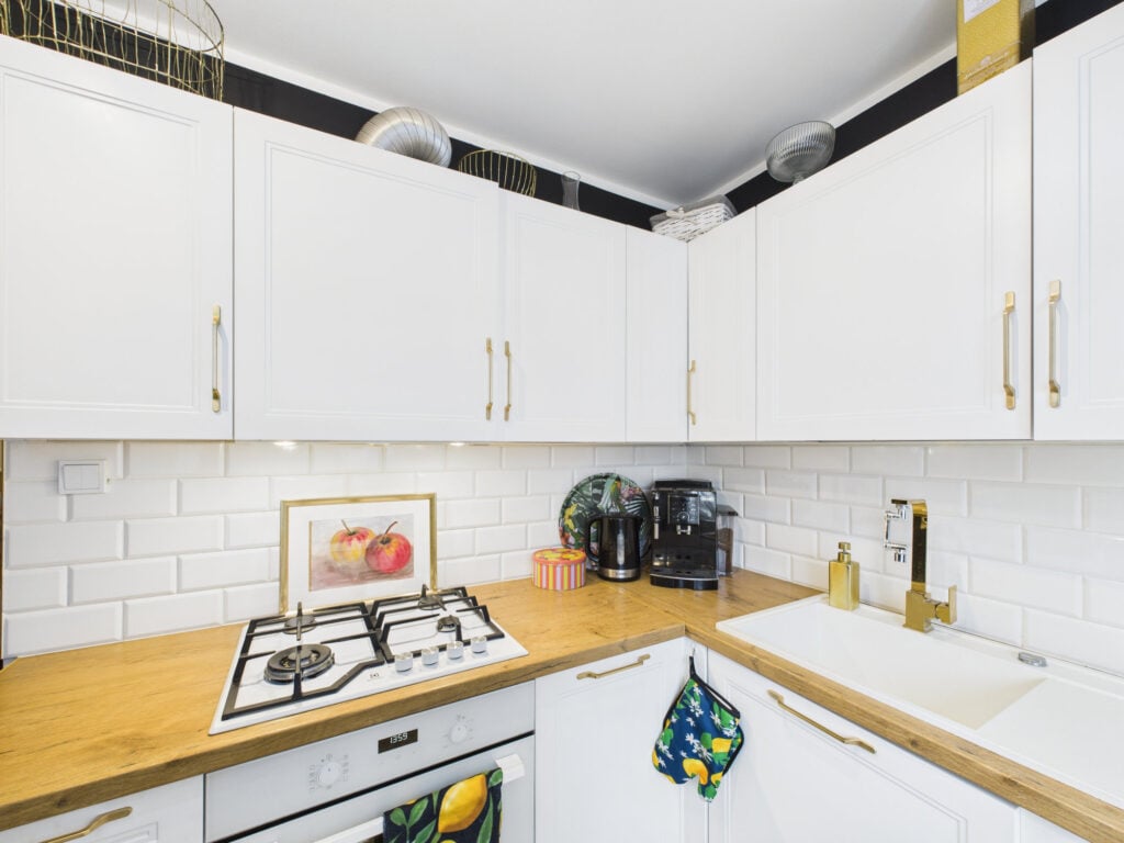 7 m² przyjemności dla tych, którzy kochają gotować. Biała zabudowa, drewniany blat i eleganckie wykończenia nadają jej charakteru. To kuchnia, w której przygotowywanie posiłków staje się przyjemnością.