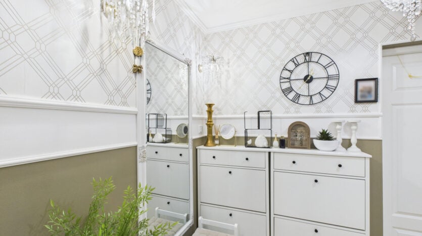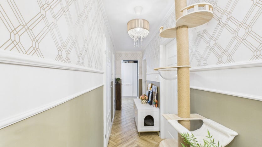 11,2 m² korytarza, który nie jest tylko przejściem – stylowe tapety, duże lustra i praktyczne szafy budują klimat eleganckiego holu.