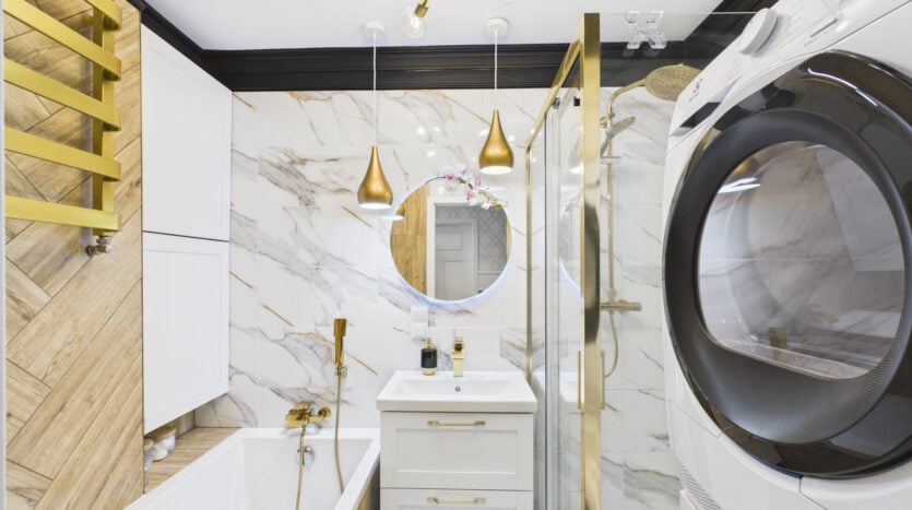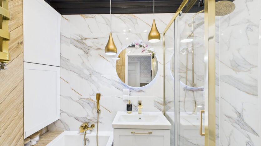 4 m² elegancji w najlepszym wydaniu. Marmurowe płytki, złote akcenty i połączenie wanny z prysznicem dają poczucie luksusu.