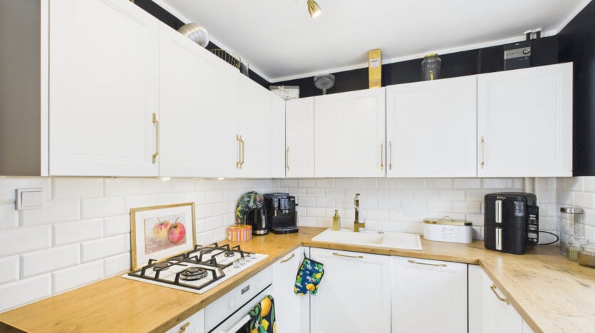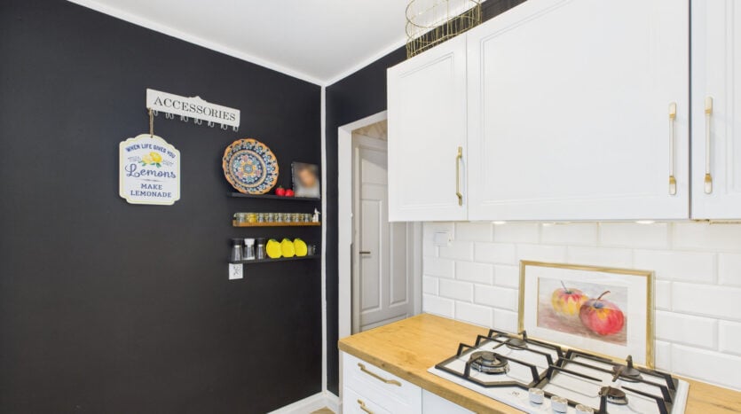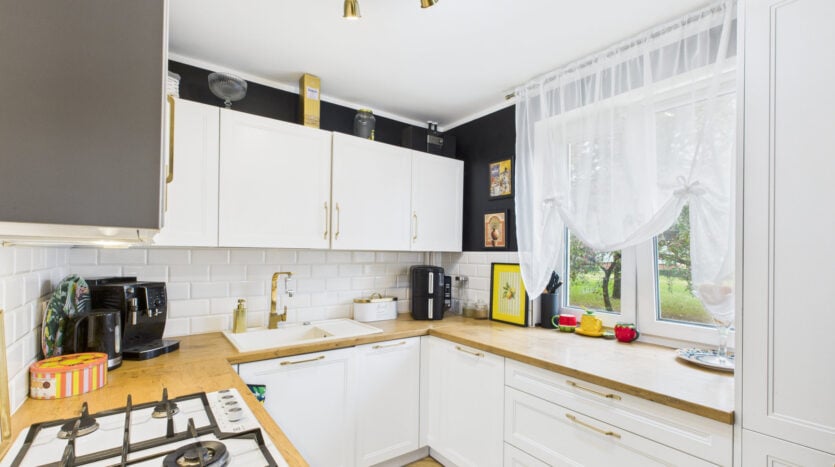 7 m² przyjemności dla tych, którzy kochają gotować. Biała zabudowa, drewniany blat i eleganckie wykończenia nadają jej charakteru. To kuchnia, w której przygotowywanie posiłków staje się przyjemnością.