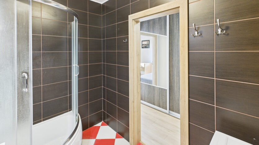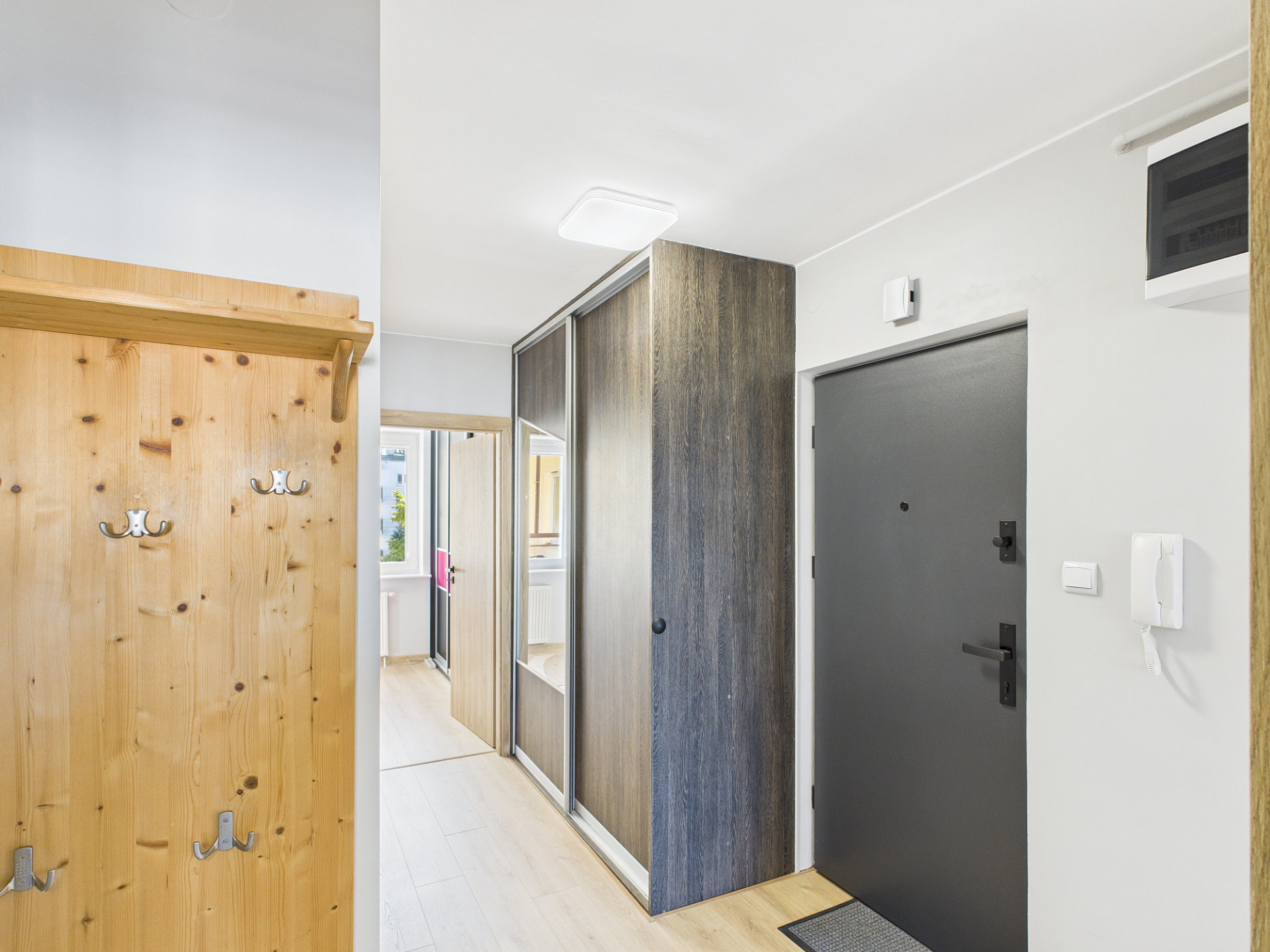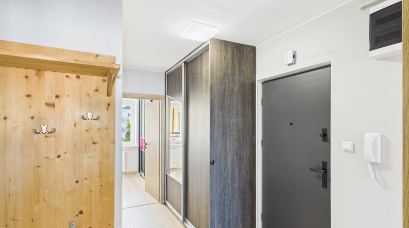Wchodząc do mieszkania, witasz się z przestronnym przedpokojem (ok. 6,6 m²), w którym znajduje się duża, przesuwna szafa w zabudowie – idealna na ubrania, buty i wszystkie niezbędne rzeczy, które chcesz mieć pod ręką, ale schowane.