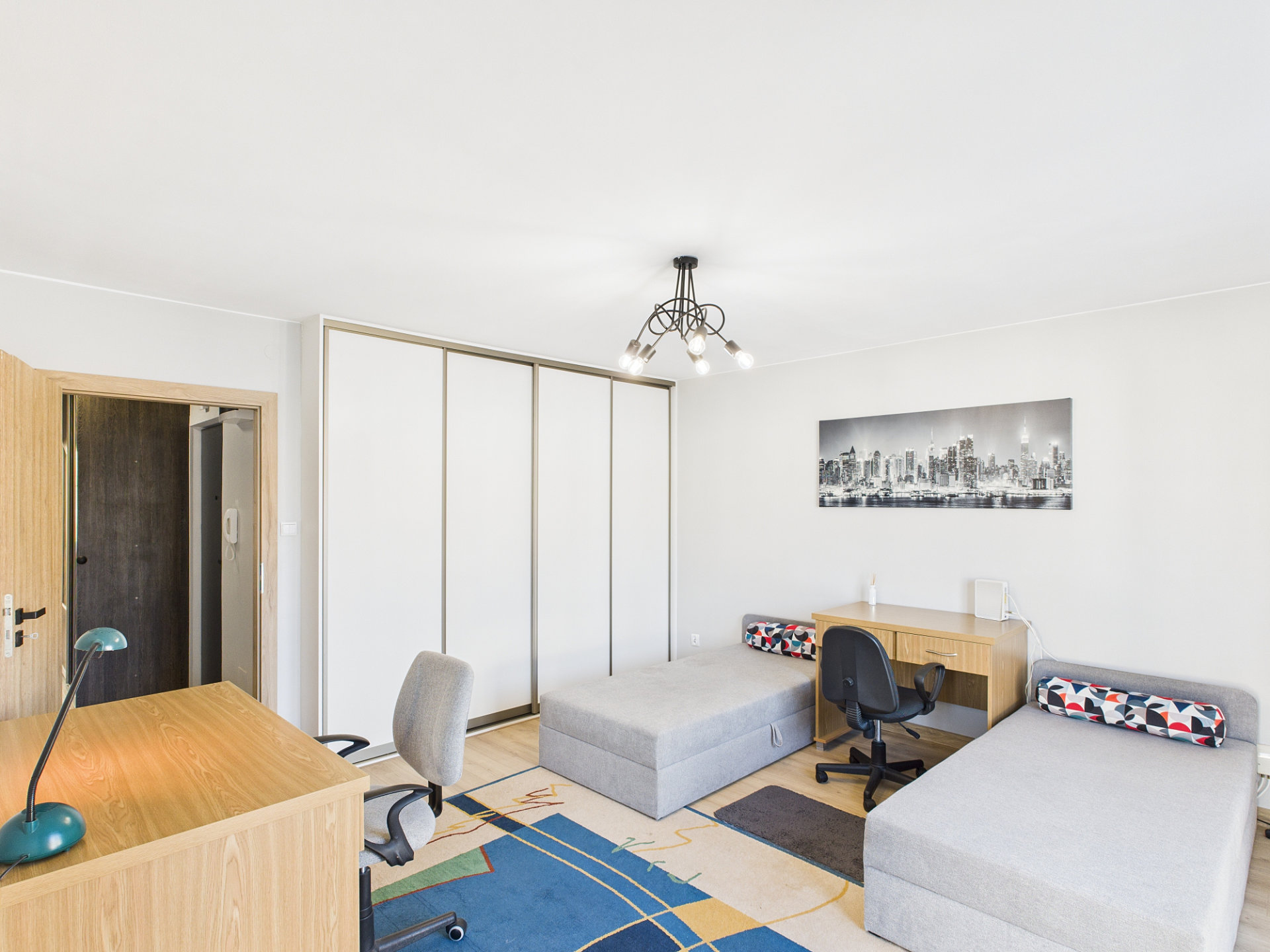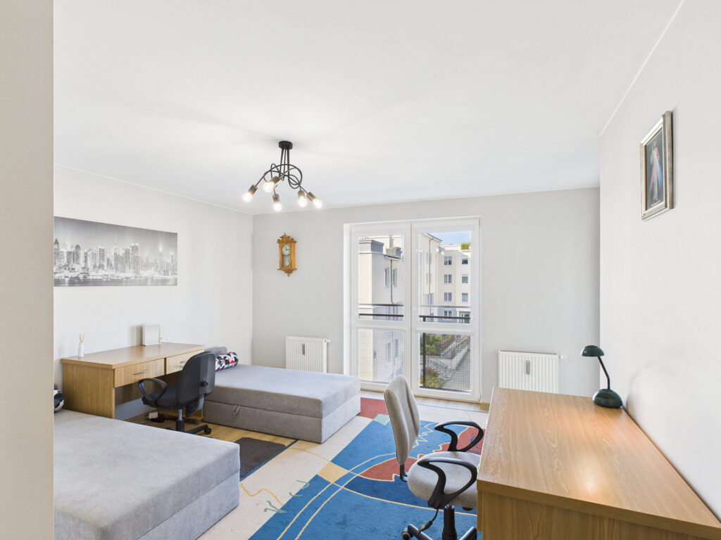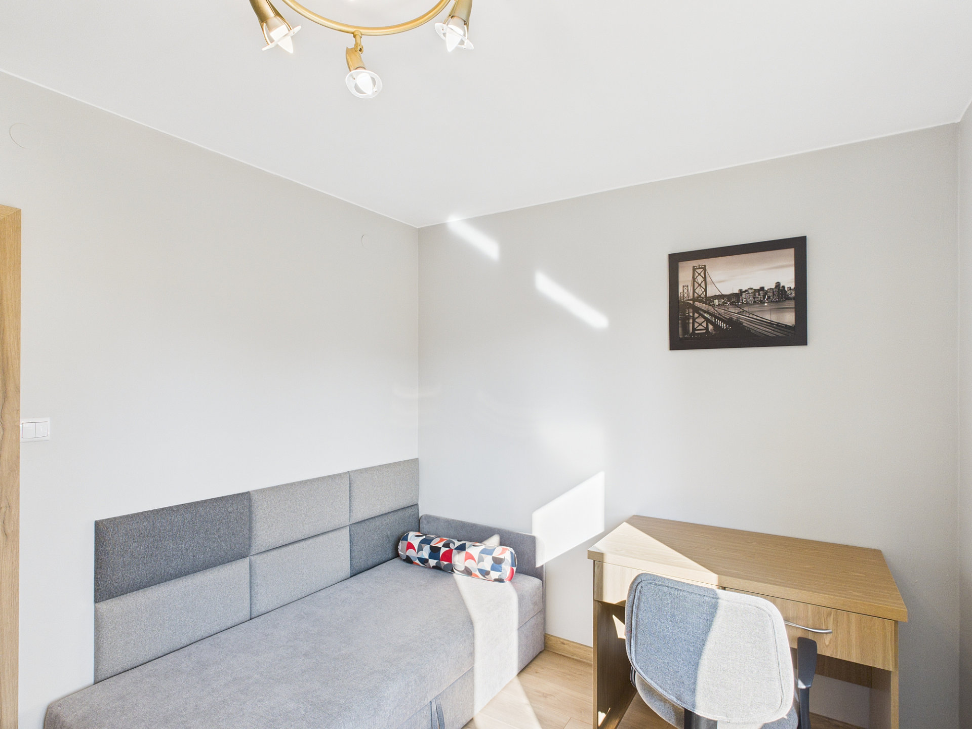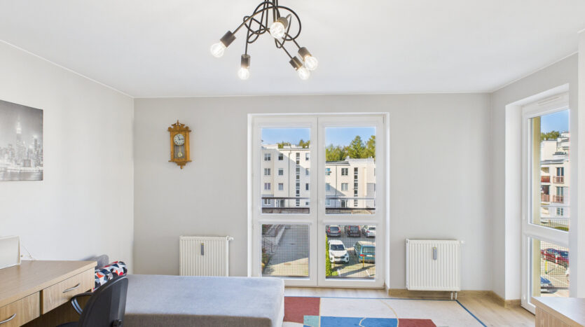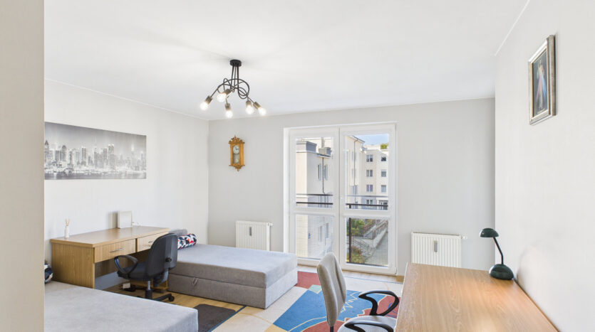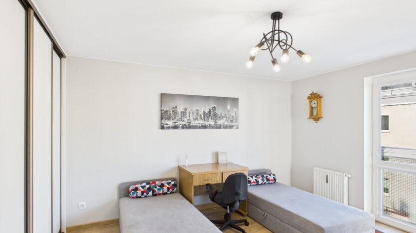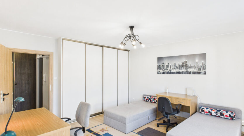 To serce mieszkania – przestronny, jasny pokój, który możesz zaaranżować zarówno jako sypialnię, jak i salon. Znajdują się tu dwa łóżka, dwa biurka, ogromna szafa przesuwna oraz dwa balkony: balkon francuski i dodatkowy balkon (2,5 m x 1,5 m) z widokiem na zewnętrzny parking. Taka przestrzeń daje pełną swobodę życia i odpoczynku.