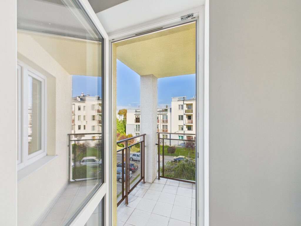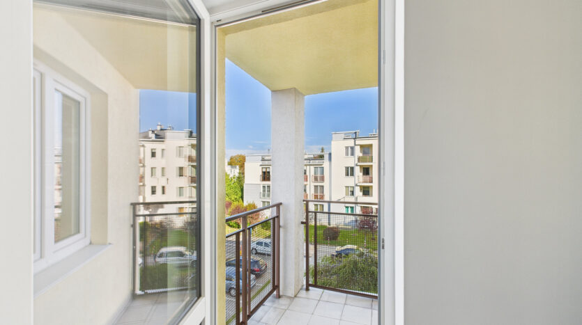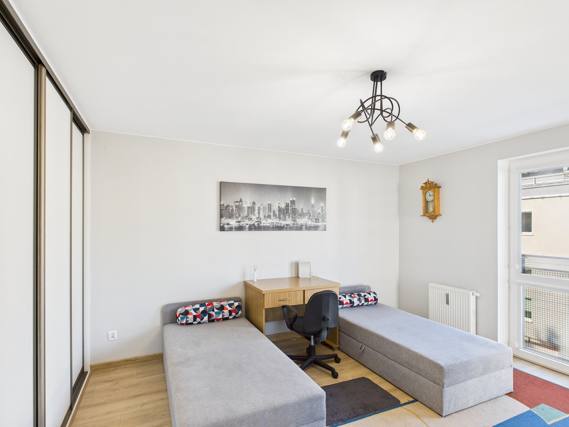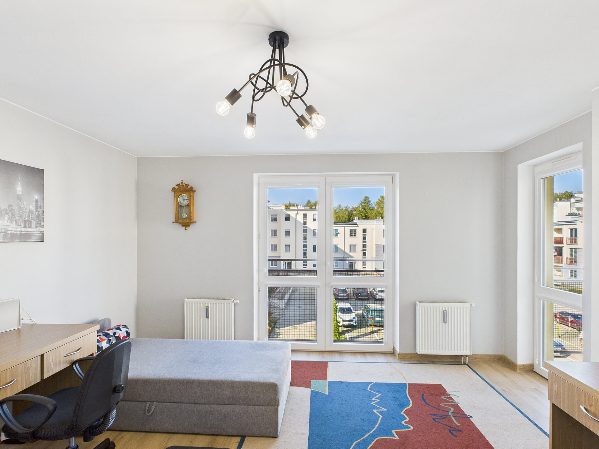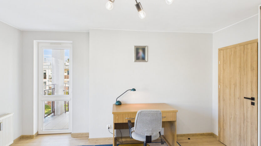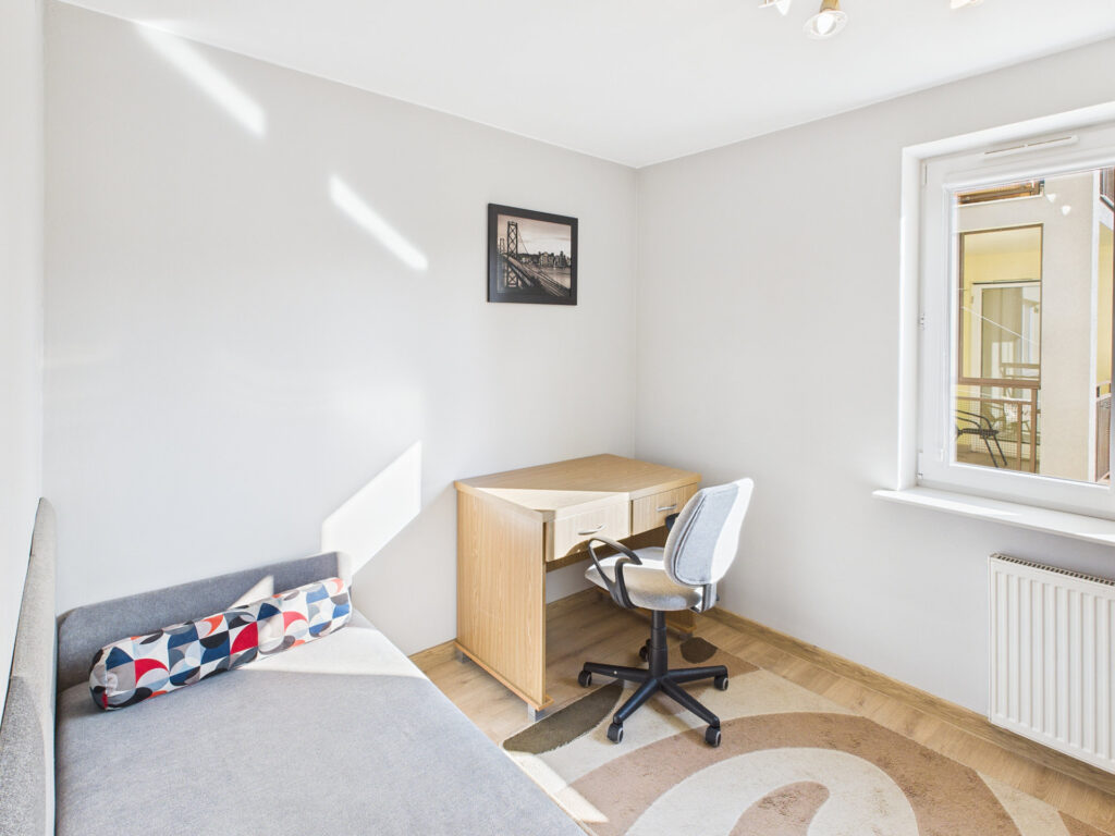To serce mieszkania – przestronny, jasny pokój, który możesz zaaranżować zarówno jako sypialnię, jak i salon. Znajdują się tu dwa łóżka, dwa biurka, ogromna szafa przesuwna oraz dwa balkony: balkon francuski i dodatkowy balkon (2,5 m x 1,5 m) z widokiem na zewnętrzny parking. Taka przestrzeń daje pełną swobodę życia i odpoczynku.