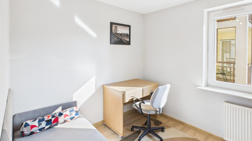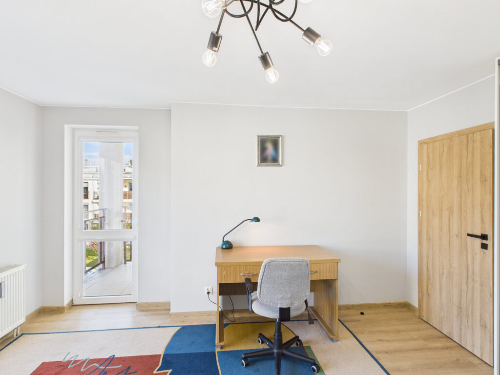 Wnętrze jest w pełni umeblowane i wyposażone, dzięki czemu możesz z niego korzystać od pierwszego dnia. Układ pomieszczeń pozwala też łatwo dostosować przestrzeń do własnych potrzeb – niezależnie od tego, czy szukasz miejsca do życia, pracy zdalnej czy nauki.