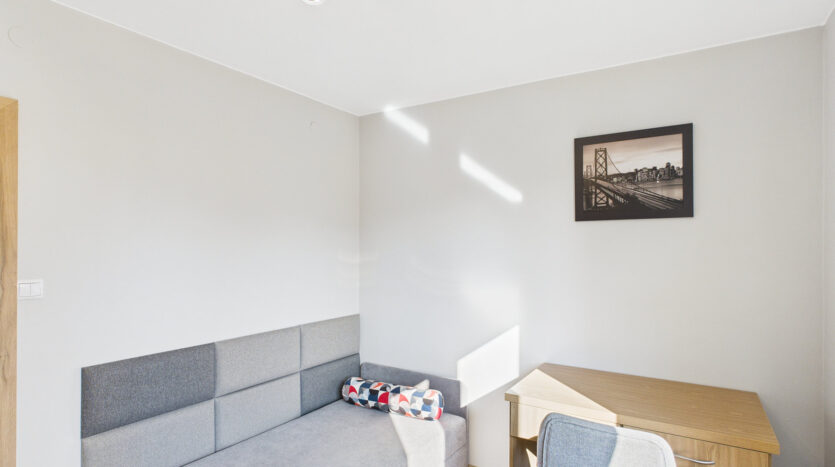 To idealna przestrzeń do pracy, nauki i odpoczynku. Znajdziesz tu łóżko pojedyncze, biurko oraz dużą szafę w zabudowie na całą długość ściany. Dzięki dużemu oknu pokój jest jasny i przytulny, a widok na zieleń sprzyja relaksowi po całym dniu zajęć lub pracy.