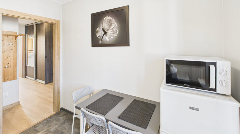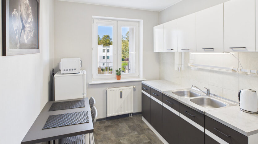 Oddzielne, funkcjonalne pomieszczenie wyposażone w kuchenkę gazową, piekarnik, mikrofalówkę, czajnik oraz lodówkę. Jest tu również miejsce na wspólne posiłki przy stole – idealne na poranne śniadania i wieczorne rozmowy przy herbacie.