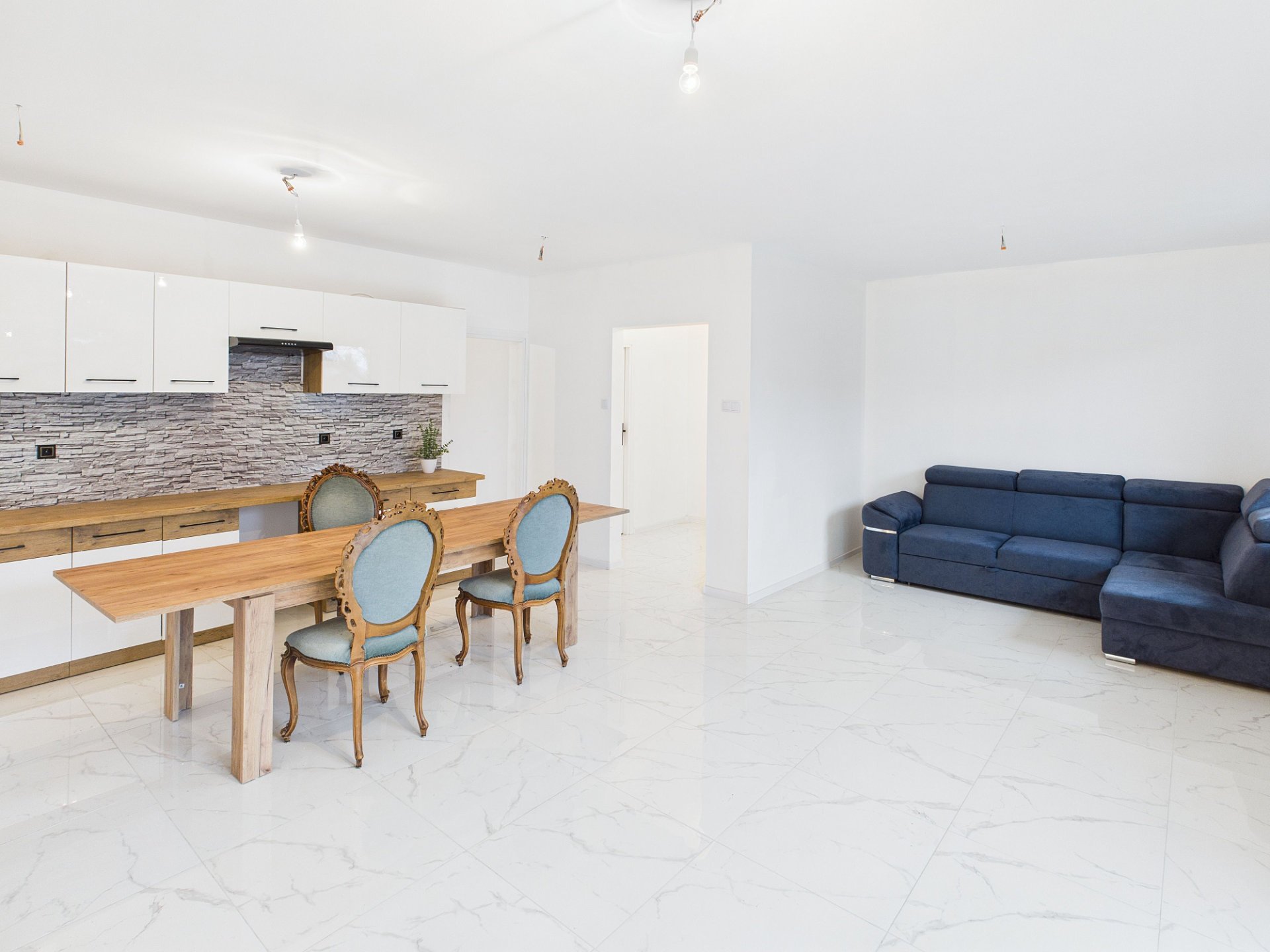 Duży salon z aneksem to serce mieszkania – jest miejsce na wygodny narożnik, stół, kącik TV i przestrzeń do pracy.