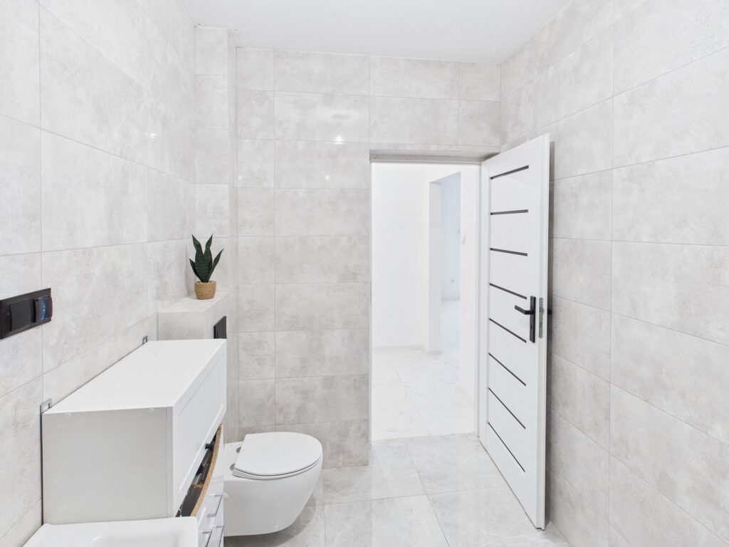 Łazienka ok. 6 m² została wykończona w praktyczny sposób: