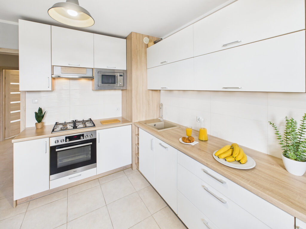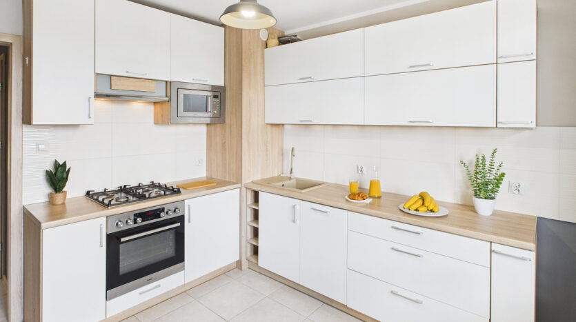 Kuchnia jest osobna 🍳, z meblami w zabudowie i kompletnym wyposażeniem AGD: zmywarka, piekarnik, mikrofalówka, kuchenka gazowa – wszystko gotowe, by gotować z przyjemnością!