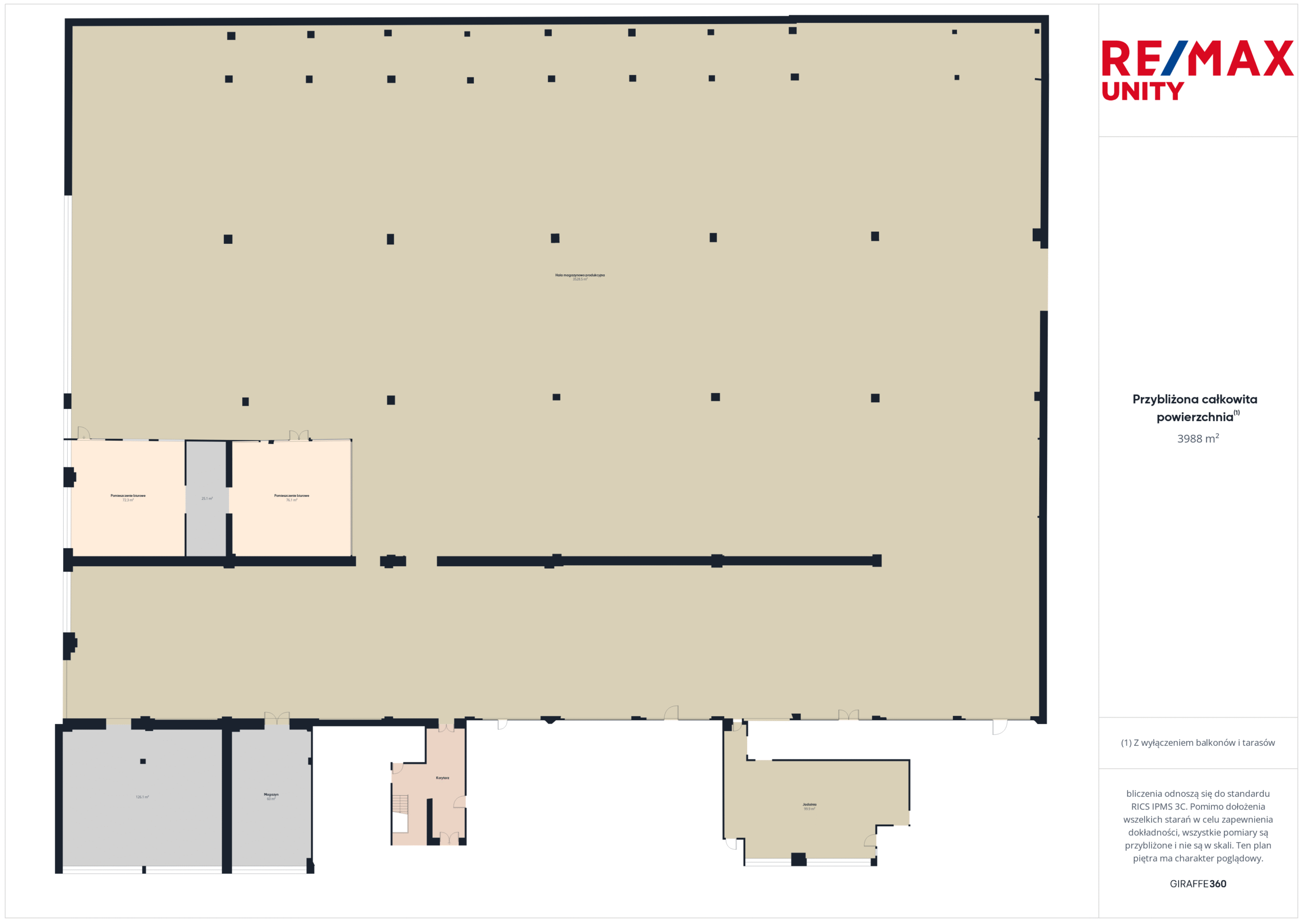 - biura: 72 m², 76 m², 25 m² (3 osobne pomieszczenia).